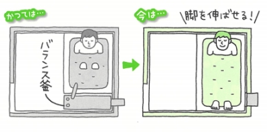 風呂釜を屋外設置型や、外壁にはめ込むタイプに替えることで、浴室内の風呂釜スペースをy浴槽の拡張に当てることができます。浴槽は20cm以上も拡がり、快適度が大幅にアップします。浴室がすっきりして、掃除しやすい空間が実現します。