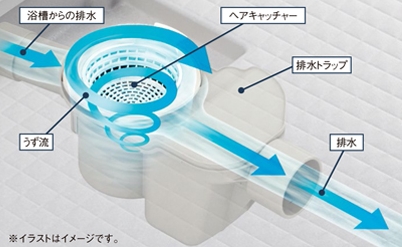 湯船の水を抜くときの流れを利用して、ゴミをまとめる排水口があります。湯船から排水された水がヘアキャッチャー内で渦をつくり、その渦の勢いで髪の毛などのゴミをまとめます。