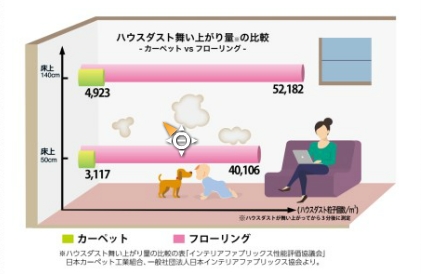 ほこりの舞い上がり軽減 ほこりが舞い上がりにくくなります。浮遊塵を減らしお部屋の空気をきれいに保つ働きをします、きちんとお掃除をすることで、とても衛生的なフロアになります。 |