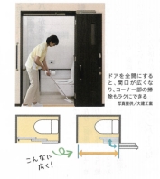開口部が広くなるため、トイレへの出入りがぐんと楽に。また、扉を全開にすることで、手が届きにくいトイレの隅々まで掃除がしやすくなり、トイレの中のメンテナンスが楽にできます。