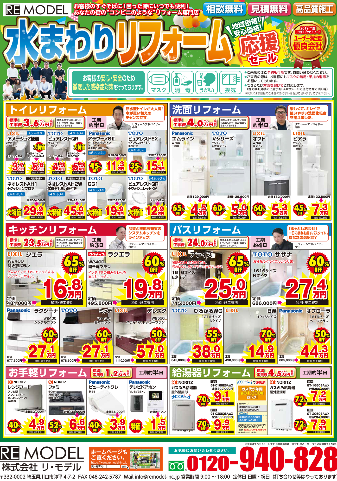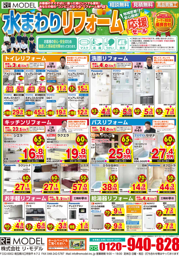 おすすめのリフォーム商品 お問い合わせ お見積り 無料見積り・相談 電話で見積り・相談 0120-940-828 【受付】9:00~18:00【定休】第2,第4土曜、日曜、祝日 電話で見積り・相談 HOME水まわりリフォーム応援セール開催中! PAGE-12810 水まわりリフォーム応援セール開催中! 画像をクリックで拡大 リ・モデルについて 選ばれる理由 会社案内スタッフ紹介会社概要アクセスマップ 施工事例 施工事例一覧 水まわり キッチン 浴室 トイレ 内装工事 外壁塗装 エクステリア 営繕・その他工事 お客様の声 お客様の声一覧 おすすめ商品 キャビネット付トイレ LIXIL Jフィットキャビネット付トイレ ¥295,000~(税込) トイレ LIXIL Jフィットキャビネット付トイレ ¥295,000~(税込) ウォシュレットセット LIXIL アメージュシャワートイレ(Dシリーズ) ¥145,000~(税込) キッチン クリナップ ラクエラ ¥970,000(税込) お風呂 TOTO サザナ Nタイプ ¥830,000円(税込) 外装塗り替え パーフェクトトップ ラジカル制御型ハイブリッド高耐侯性塗料 日本ペイント ¥698,000~(税込) 商品ラインナップ一覧 トイレ キャビネット付トイレ ウォシュレットセット キッチン お風呂 修繕/メンテナンス 外装塗り替え 洗面化粧台 リ・モデルのブログ ブログ記事一覧 お役立ち情報 リ・モデルからのお知らせ リフォームの流れ よくある質問 お問い合わせ お問い合わせ お見積もり リ・モデルのお役立ち情報 くわしく見る
