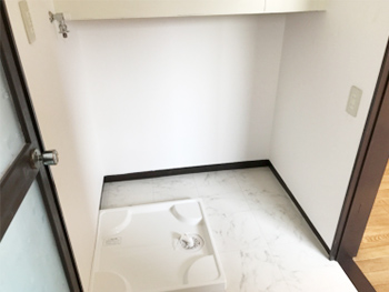 床の柄は人気のマーブル調になりました。床を変えるだけでずいぶん雰囲気が変わります。洗濯パンを置いて排水設備も万全です。